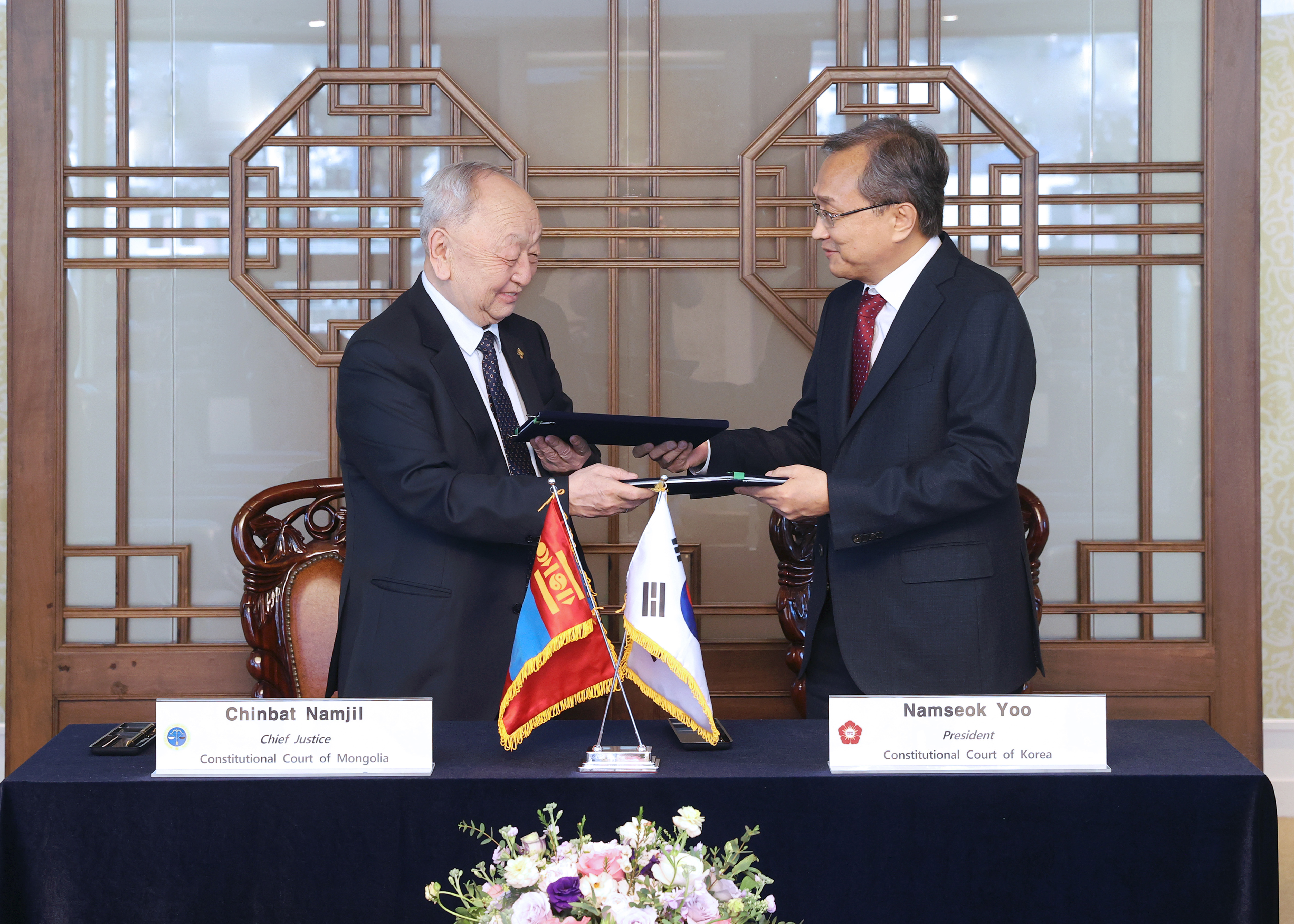유남석 헌법재판소장은 1월 16일 헌법재판소 청사에서 몽골 헌법재판소 친밧 남질(Chinbat Namjil) 헌법재판소장과 양 기관 간 상호협력에 관한 양해각서(MOU)를 체결했습니다.