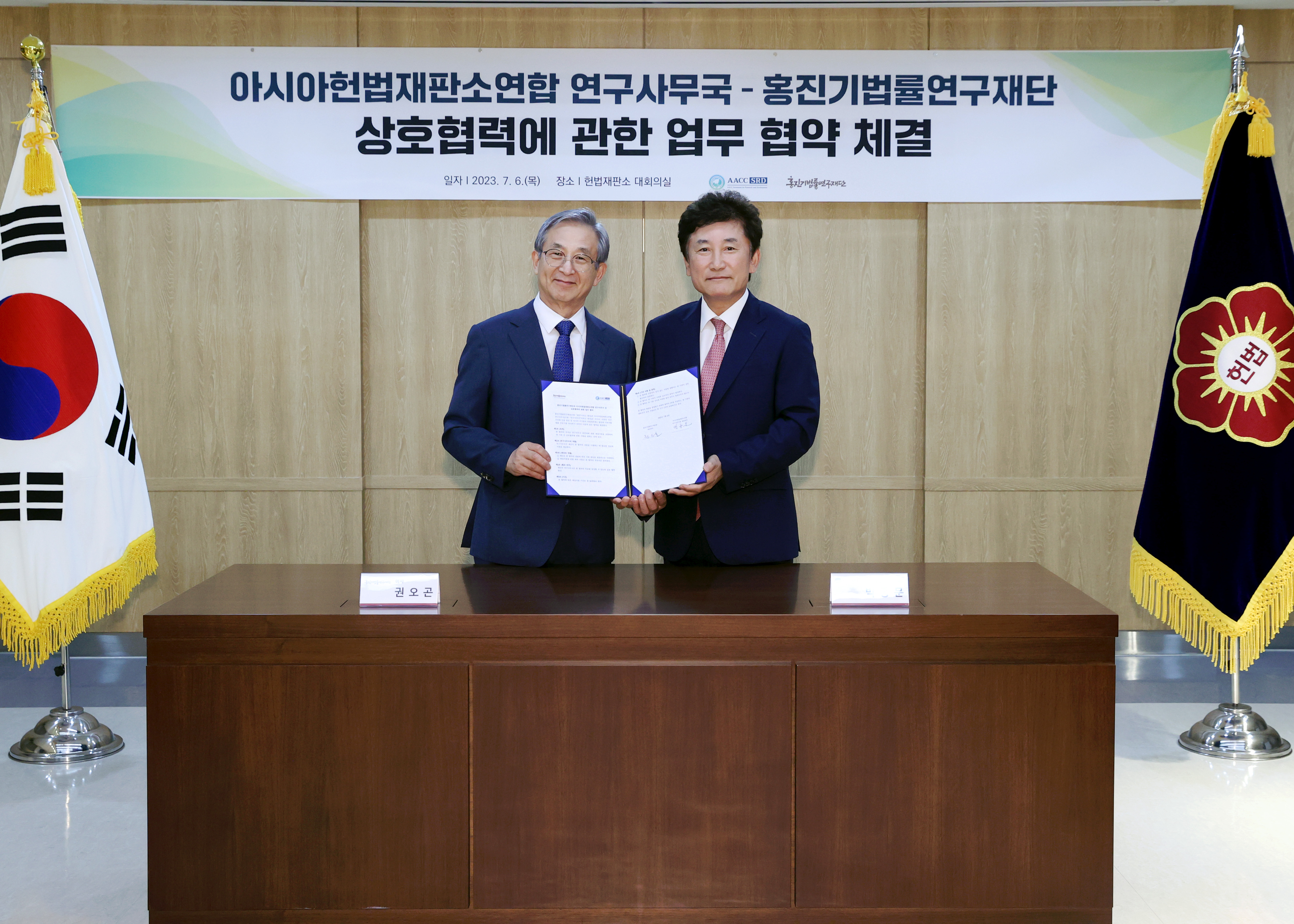 2023년 7월 6일, 아시아헌법재판소연합(AACC) 연구사무국과 홍진기법률연구재단은 아시아 지역의 민주주의와 인권 증진 및 아시아 국가들의 헌법재판제도 발전에 이바지할 법률 전문가를 육성하기 위하여 AACC 연구사무국 해외파견자에 대한 연구 지원을 주요 내용으로 하는 업무 협약(MOU)을 체결했습니다.