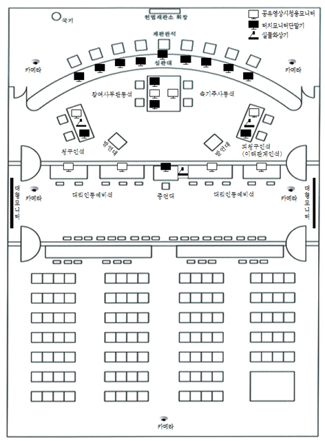 제3조(심판정의 배치) 대심판정의 좌석 및 장비 등의 배치는 별지 1과 같이 하고, 소심판정의 좌석 및 장비 등의 배치는 별지 2와 같이 한다.