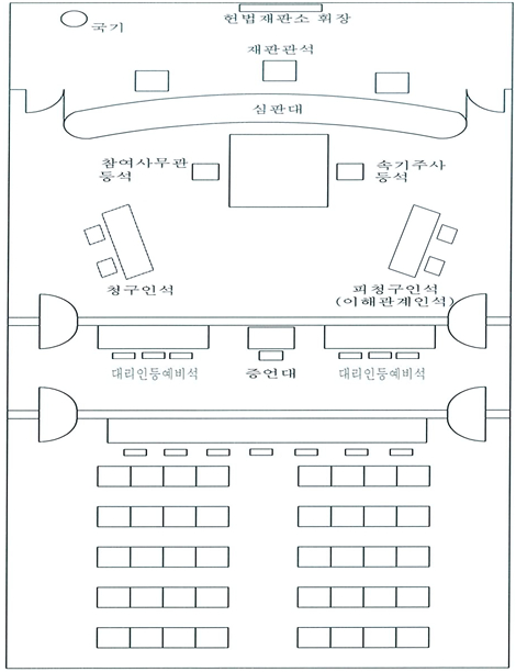 ② 청구인 및 피청구인의 좌석은 재판관을 향하여 청구인은 좌측, 피청구인은 우측에 배치한다. <개정 1995·6·1, 2019·7·19>